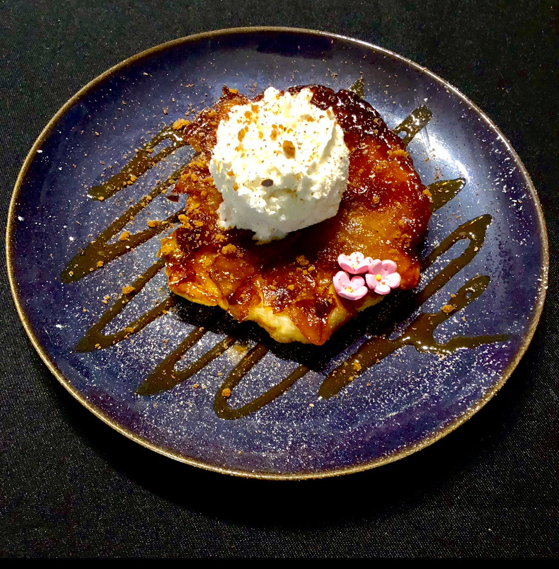 Tatin de pommes, avec un caramel au beurre salé infusé aux fleurs de sakura, glace vanille de Madagascar