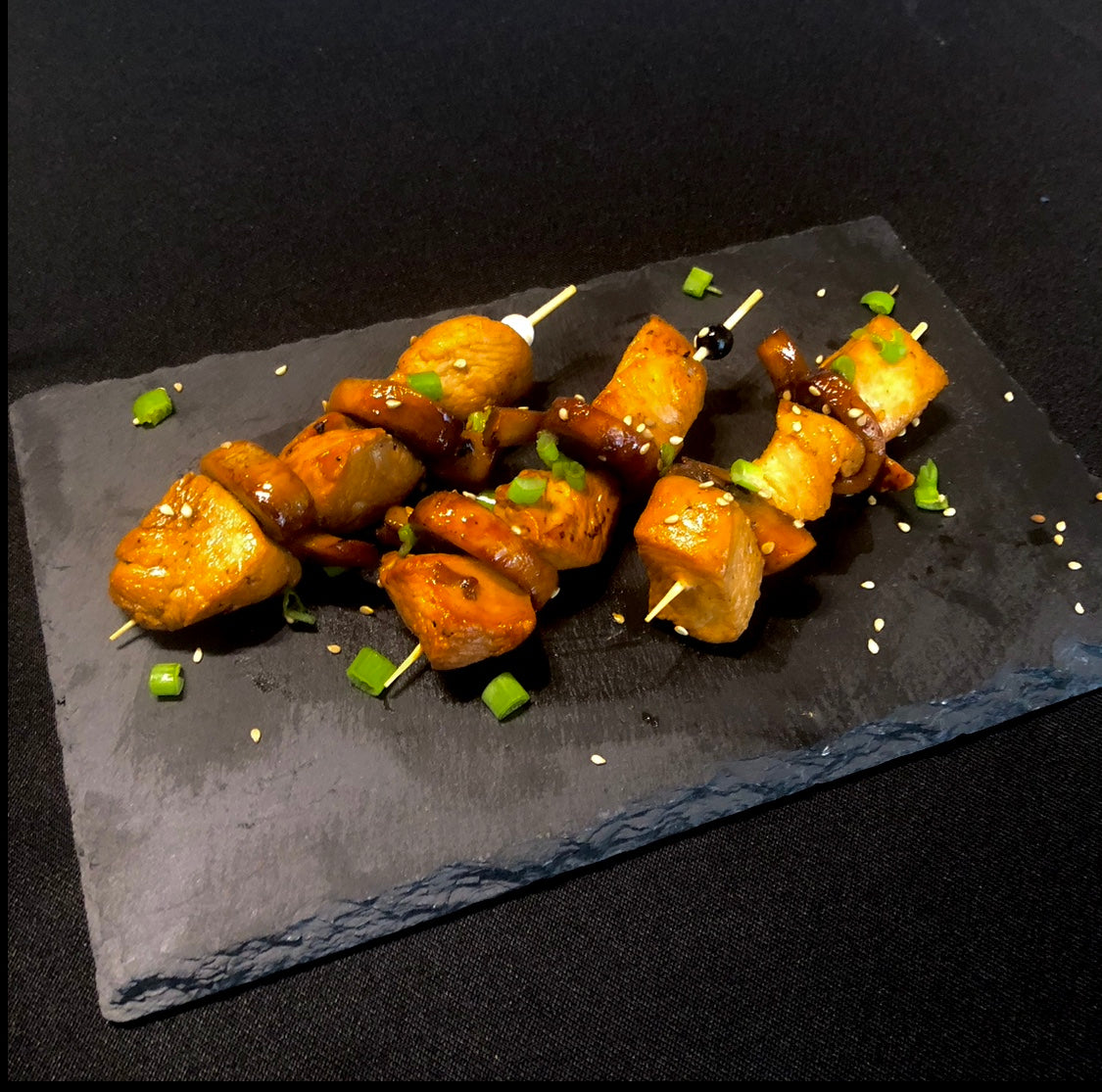 Brochettes de poulet Teriyaki marinées à l'huile de sésame et au Fushimi (piment doux japonais), et aux champignons rôtis à l'ail noir