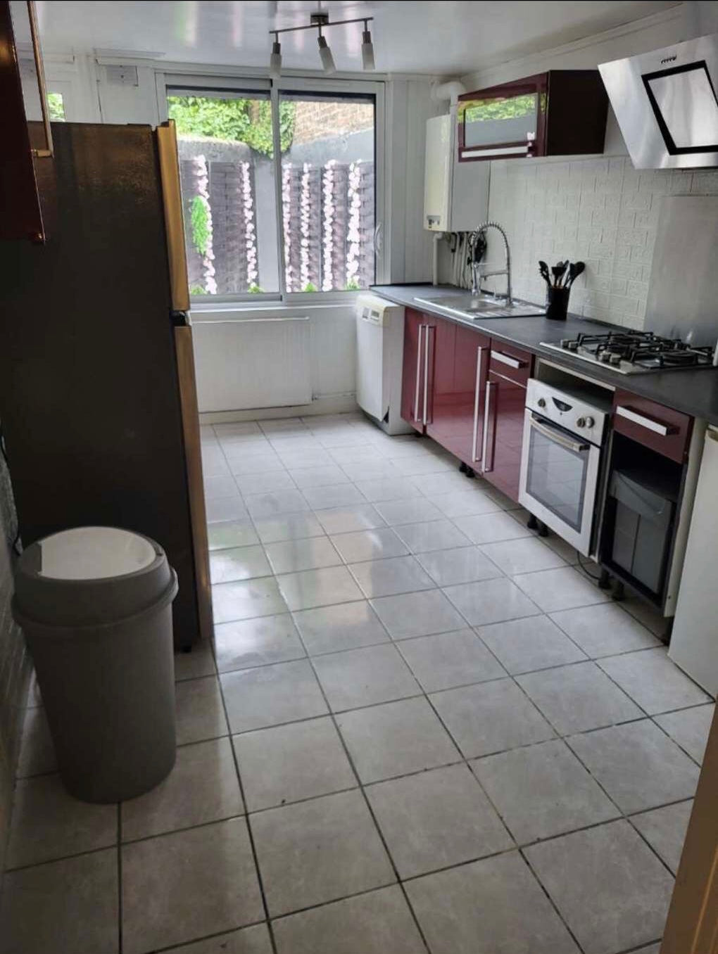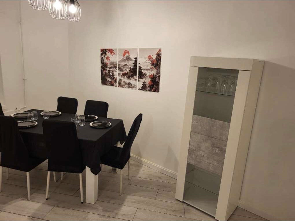 Cuisine de 12m2 entièrement équipée avec réfrigérateur, congélateur, four, micro-ondes, air fryer, 2 cafetières et une collection complète de vaisselle et ustensiles.
